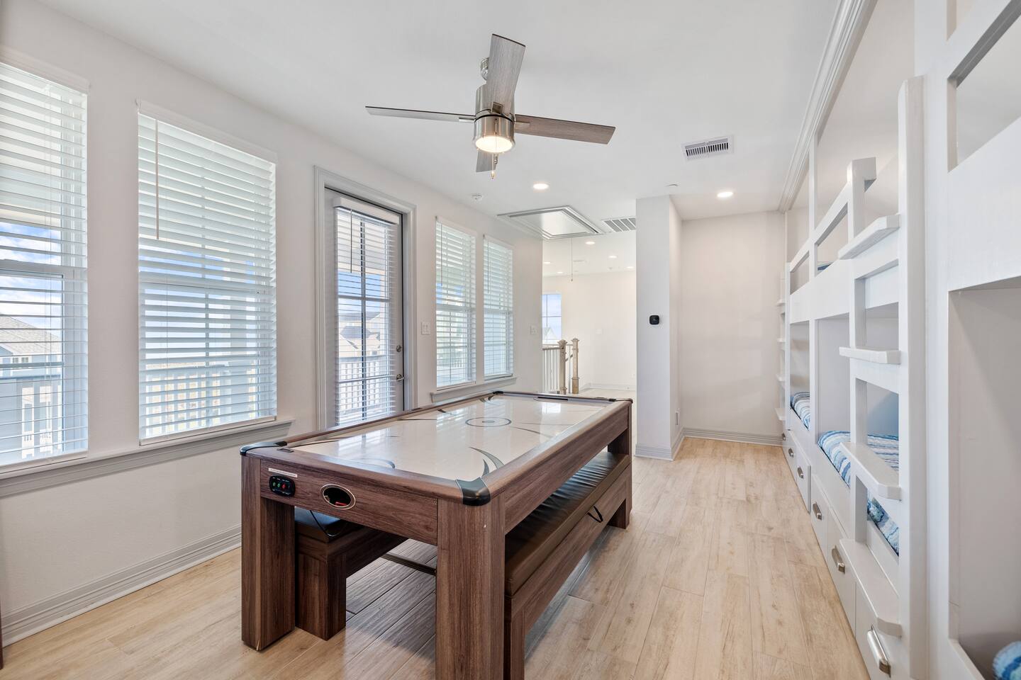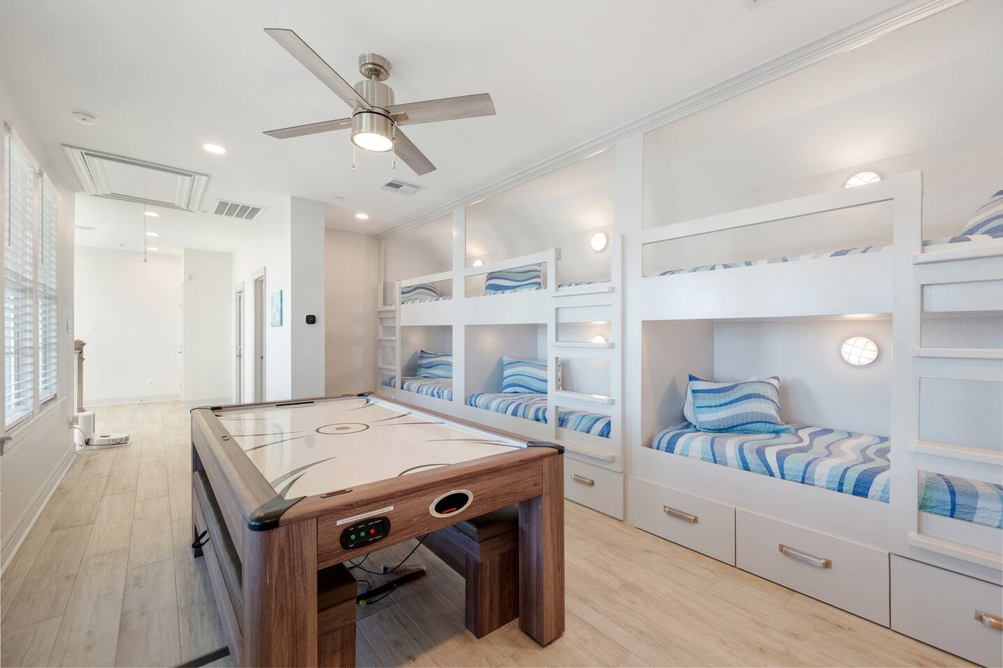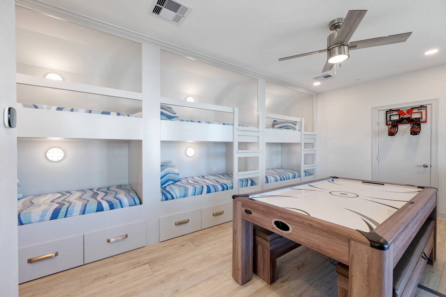 This 4,000 square feet luxurious beach home is equipped with countless thoughtful touches and can accommodate up to 16 guests (maximum 10 adults) making it the perfect choice for a larger group of family or friends. An in-home elevator that services the lower three levels is a fantastic perk to bring luggage or groceries upstairs using the provided cart. The bright and airy open living area has plenty of comfortable seating for relaxing, watching TV or enjoying the beach view. A great feature for guests that enjoy entertaining is a wet bar with a beverage cooler. In the beautiful kitchen, cook with ease using the top-of-the-line appliances such as a 48-inch gas range and double oven or appreciate other kitchen bonuses such as a high-volume ice maker (one of three in the house) that ensures a steady supply of ice for drinks for your entire group. Meal preparation is easy and convenient in this well-stocked kitchen and there is plenty of space for the whole group to dine together at the dining table, oversized kitchen island, or even at the Polywood dining table on the front deck! When it is time to unwind for the day, retreat to one of the five comfortable bedrooms all with en-suite bathrooms. There's one master bedroom on the main floor and two additional master bedrooms on the third floor, one of which is the main master bedroom. The main master boasts a walk-in closet, beach facing deck access, and an expansive bathroom with a spa-like feel including dual shower heads and a soaking tub. Additionally, there is a dedicated workspace in the master bedroom, where vacationers can work from the beach with ease. With free high-speed WiFi and central air conditioning, you'll have everything you need to stay connected and comfortable while enjoying your vacation. The fourth floor is the perfect escape for kids offering bunk beds that sleep 6, an air hockey/Ping-Pong table, basketball hoop, and a crow’s nest with a telescope facing the gulf. A washer and dryer are a great convenience for washing beach towels or swimsuits and makes packing less stressful. The entertainment options in this home are endless and include an Xbox One with Kinect in the media room, 4K Smart TVs throughout the home to watch a movie of your choice (with Xfinity cable, Netflix, Hulu, Amazon Prime, and Disney+), or technology free board games, books, or puzzles. Undoubtedly, one of the best parts of this home are the amazing four levels of decks/outdoor space where you can take in breathtaking sunrises and sunsets. On the ground level there is an outdoor shower perfect for washing away the sand after a trip to the beach, a 32-inch marine grade gas grill, a fire pit perfect for smores making, hammock swings to unwind in and a closet especially for guests filled with a wagon, beach chairs, boogie boards and other beach toys. A ChargePoint Level 2 EV charger is available for use in the garage and is a valuable “extra” for guests with electric vehicles. This vacation home is equipped with a range of safety features to ensure a comfortable and secure stay for guests. A whole-house water filtration system and three whole-house MERV 13 air filtration units, equipped with UVC technology, eliminate bacteria and viruses, providing clean air and water for guests. Tamper-proof outlets throughout the home and retractable gates for stairs keep children and safe and secure, while a next-generation firewall ensures a safe internet experience. All of these features work together to create a safe and secure vacation home experience. As part of Pointe West Resort, this home provides access to resort amenities (with wristband purchase) that include a pool with infinity ledge, kids' pool, lazy river, game room, basketball court, pickleball court, and a fitness center. Don’t wait! Book your stay at Serene Shores now and create unforgettable memories with your loved ones!